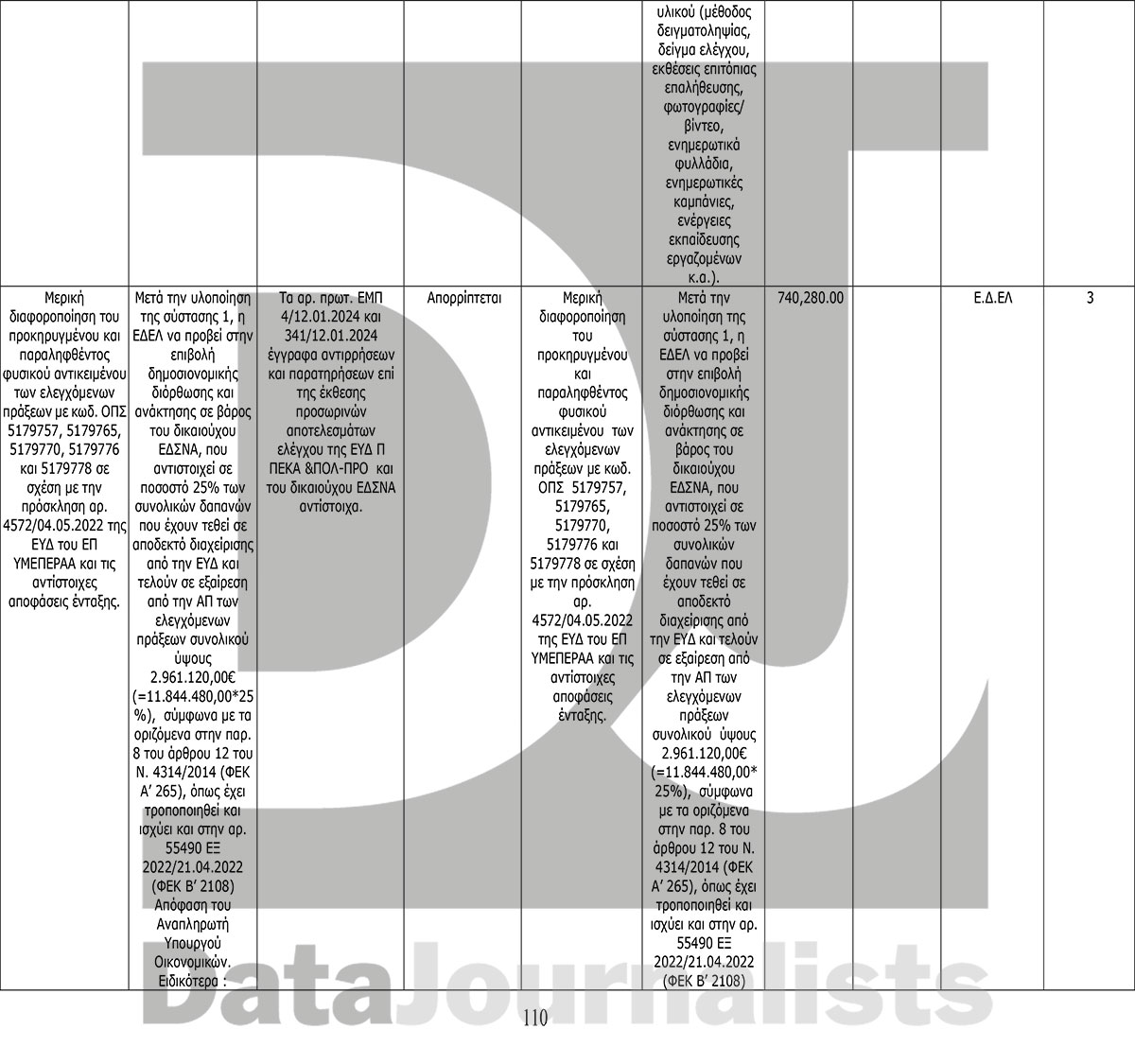 Όμως, οι έρευνες της ΕΔΕΛ εντοπίστηκαν στους τρεις φορείς και κατέληξαν, δύο χρόνια αργότερα σε τρία πρόστιμα που υπέγραψε ο Γενικός Γραμματέας Διαχείρισης Τομεακών Προγραμμάτων ΕΤΠΑ, ΤΣ και ΕΚΤ, Βασίλειος Σιαδήμας. Τα πρόστιμα με την «επιβολή ανάκτησης αχρεωστήτως ή παρανόμως καταβληθέντος ποσού», φθάνουν στο συνολικό ύψος των 39.662.480 ευρώ. Τα 18.136.860 αφορούν τον ΕΔΣΝΑ, 10.935.400 τον ΕΣΔΑΚ και 10.590.220 για τον ΦΟΔΣΑ Πελοποννήσου και η ζημιά διαχέεται στους δήμους που απαρτίζουν κάθε φορέα και φυσικά τους δημότες τους. Στις αποφάσεις καταλογισμού, οι τρεις φορείς κατηγορούνται ότι: