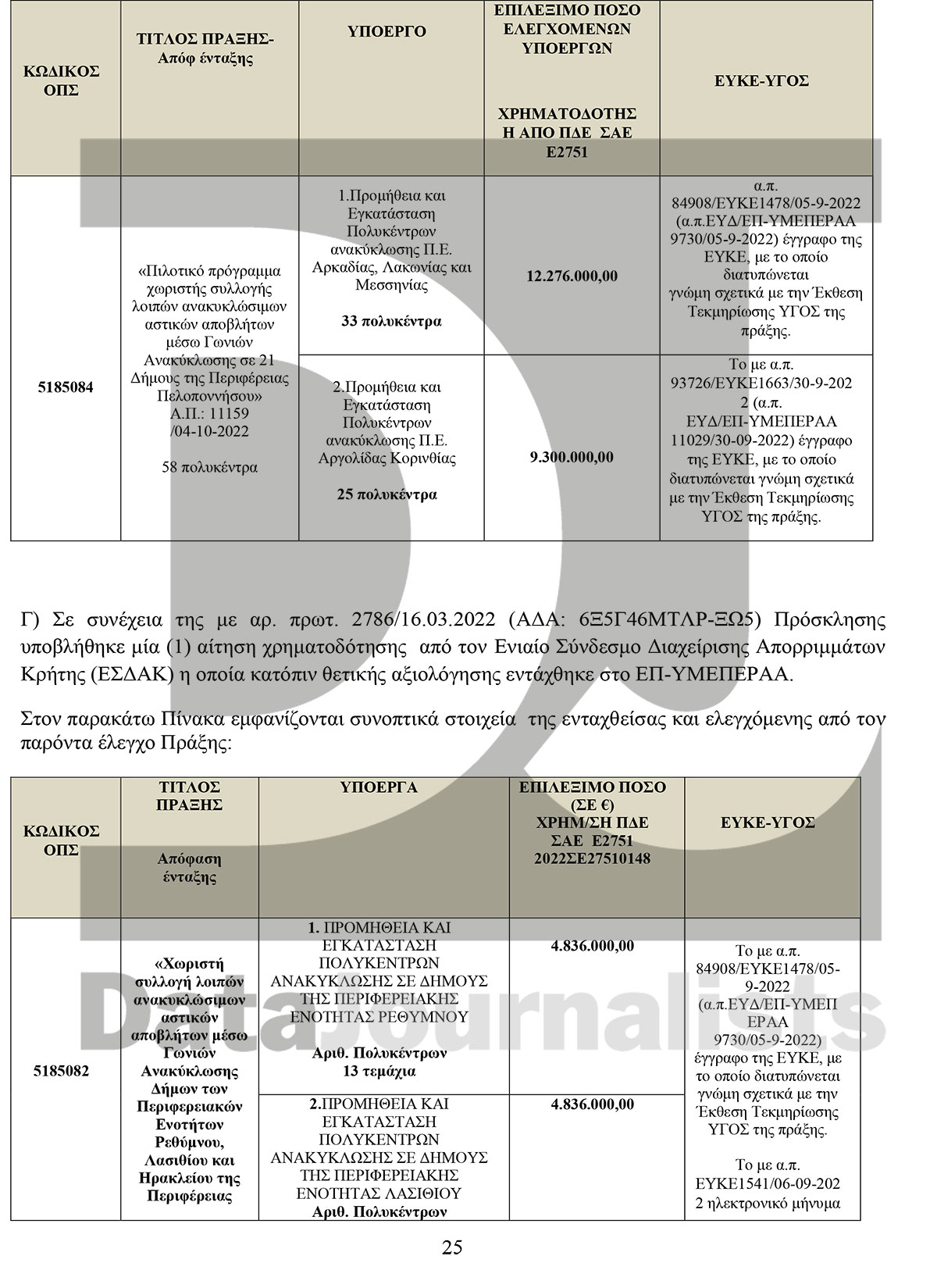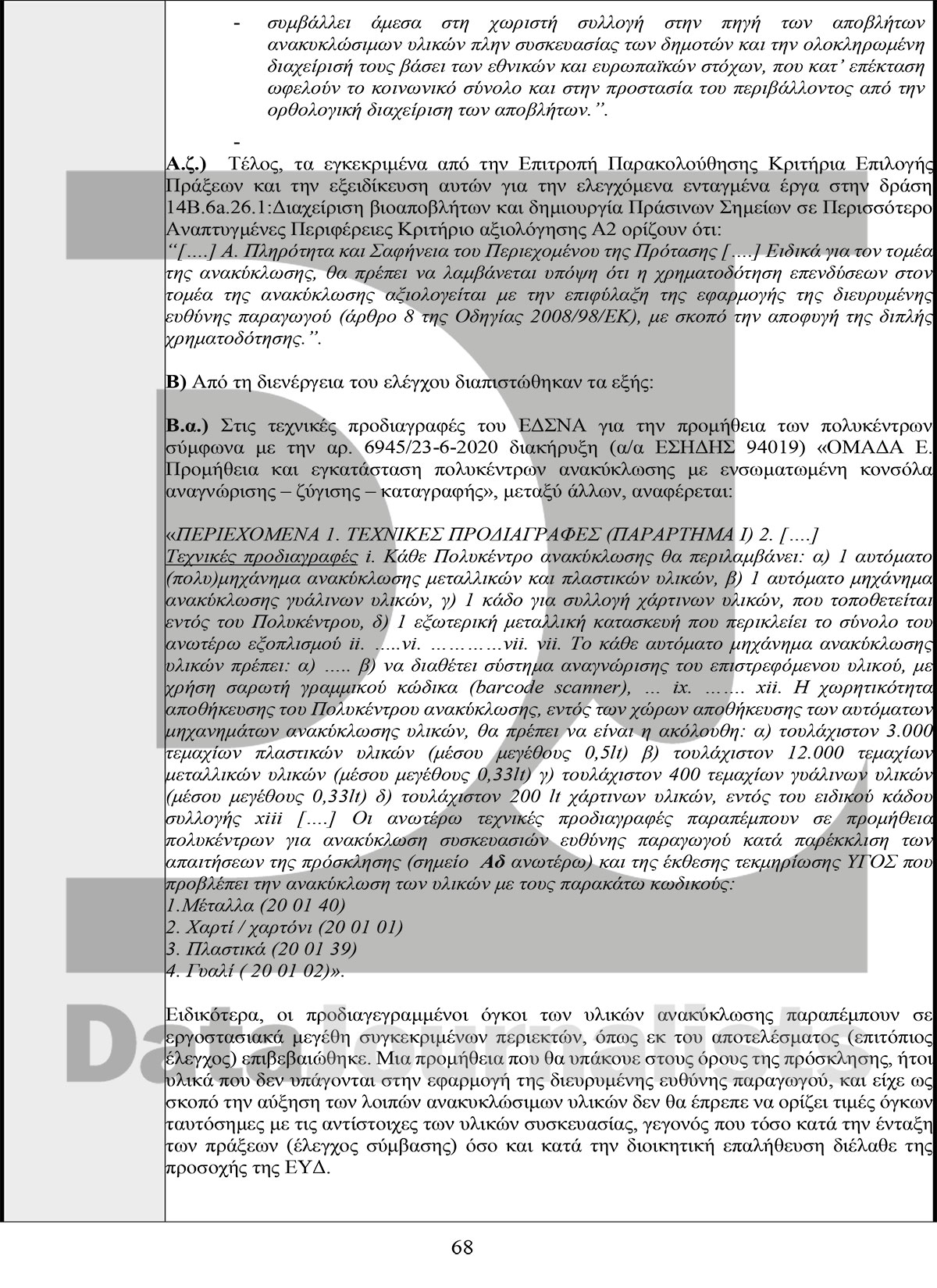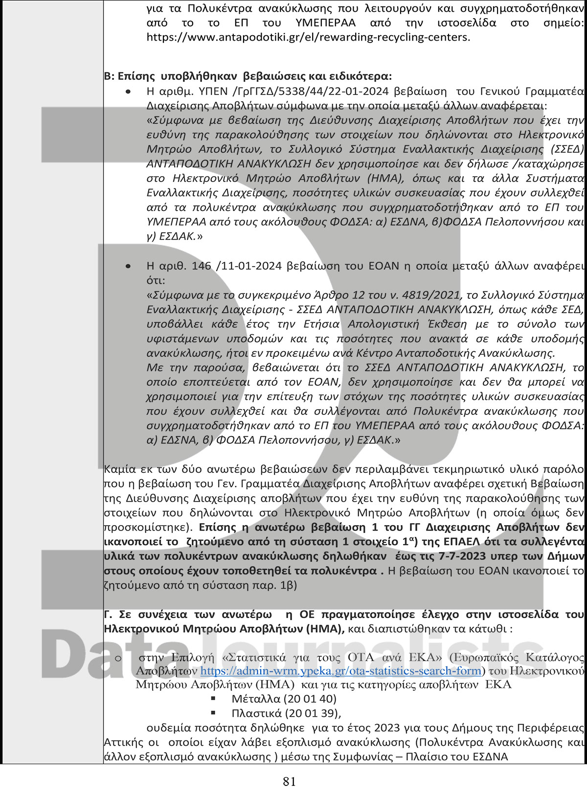 – Υπήρχε σύσταση προς τον ΕΔΣΝΑ να τεκμηριώσει με βεβαίωση της Γενικής Γραμματείας Συντονισμού Διαχείρισης Αποβλήτων του υπουργείου Περιβάλλοντος, ως αρμόδια Υπηρεσία εποπτείας του Ηλεκτρονικού Μητρώου Αποβλήτων (ΗΜΑ), ότι τα συλλεγέντα υλικά των πολυκέντρων ανακύκλωσης που συγχρηματοδοτήθηκαν από το ΕΠ του ΥΜΕΠΕΡΑΑ δηλώθηκαν για το διάστημα έως τις 7-7-2023 υπέρ των Δήμων στους οποίους αυτά είχαν τοποθετηθεί.