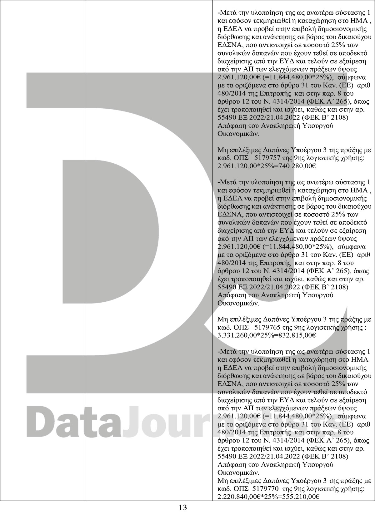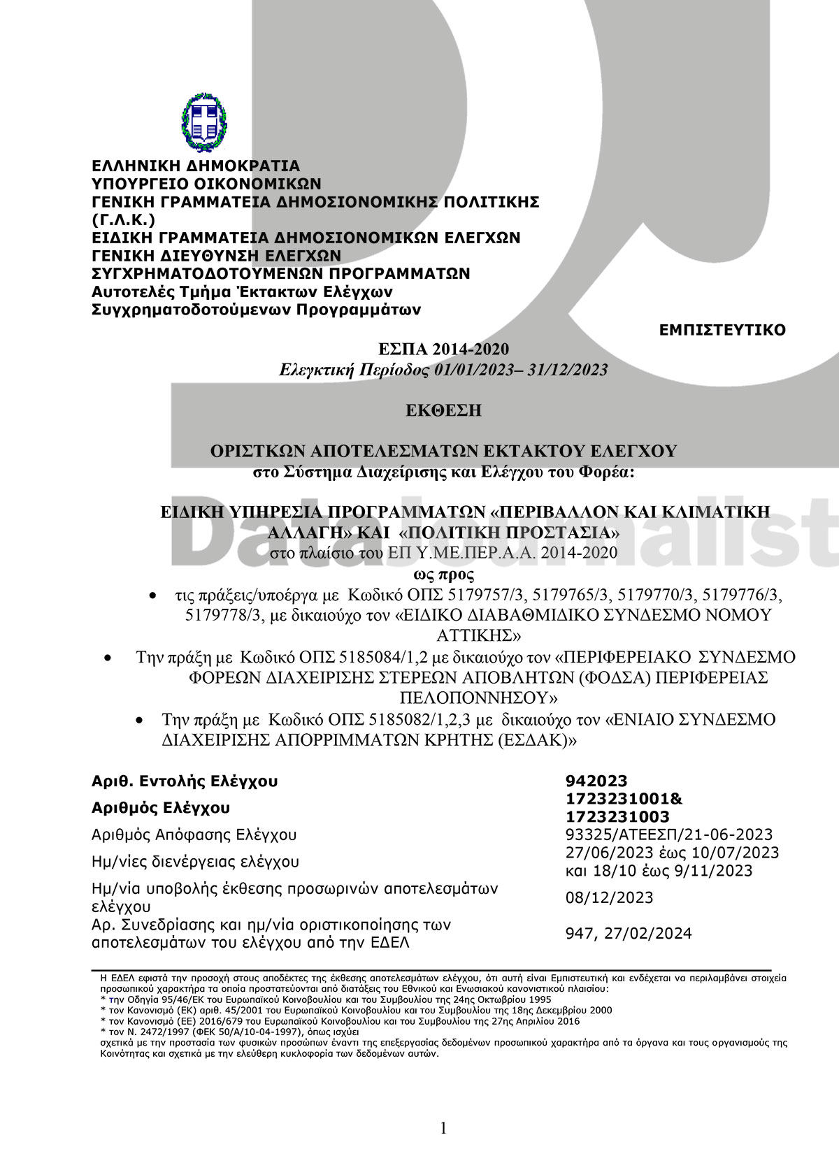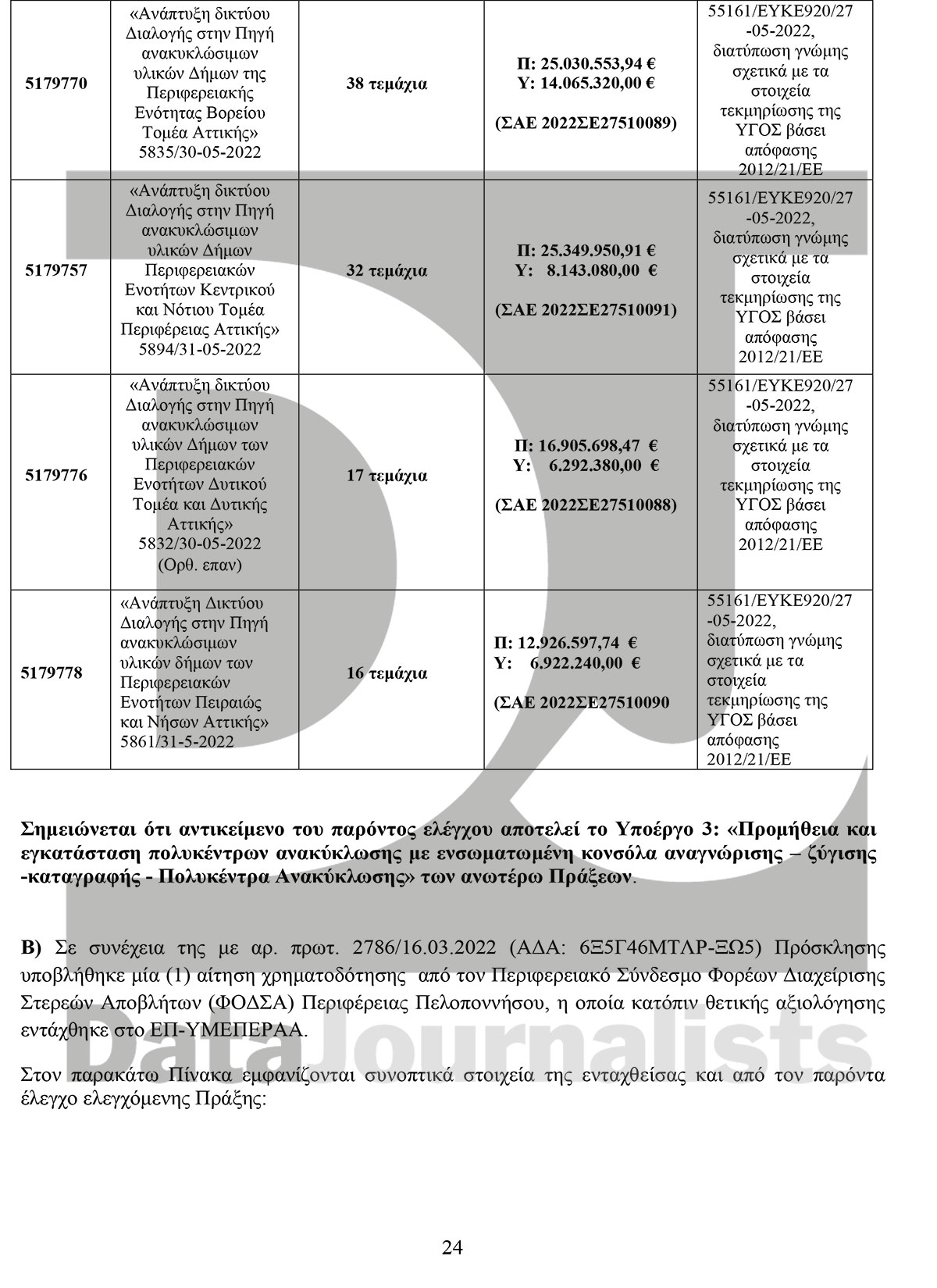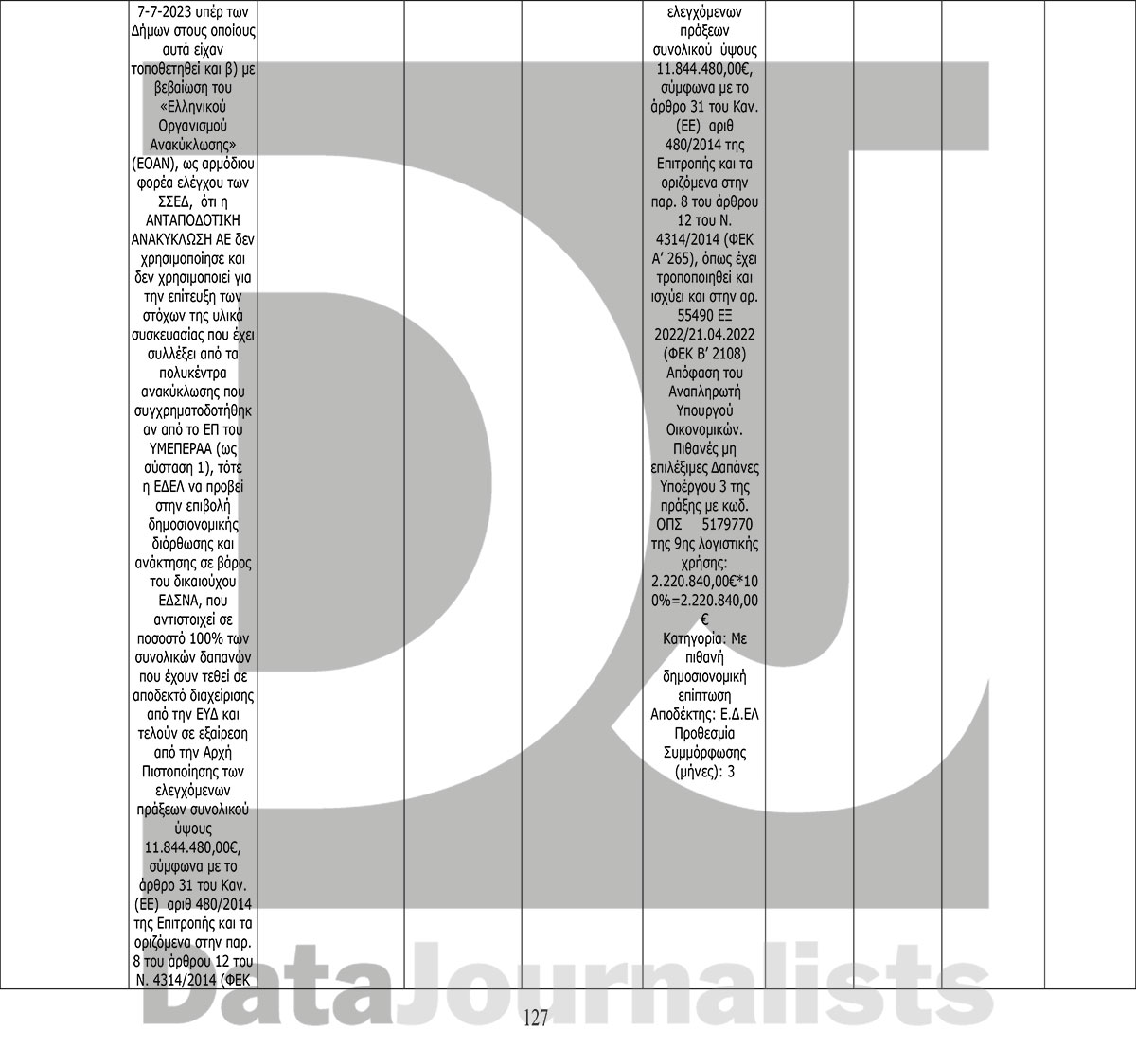 – Υπήρχε σύσταση προς τον ΕΔΣΝΑ να τεκμηριώσει με βεβαίωση της Γενικής Γραμματείας Συντονισμού Διαχείρισης Αποβλήτων του υπουργείου Περιβάλλοντος, ως αρμόδια Υπηρεσία εποπτείας του Ηλεκτρονικού Μητρώου Αποβλήτων (ΗΜΑ), ότι τα συλλεγέντα υλικά των πολυκέντρων ανακύκλωσης που συγχρηματοδοτήθηκαν από το ΕΠ του ΥΜΕΠΕΡΑΑ δηλώθηκαν για το διάστημα έως τις 7-7-2023 υπέρ των Δήμων στους οποίους αυτά είχαν τοποθετηθεί.