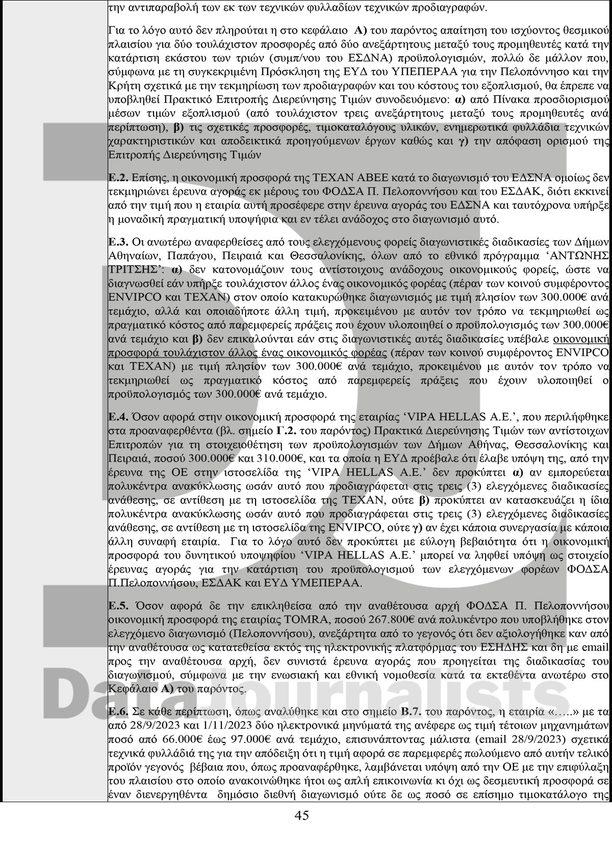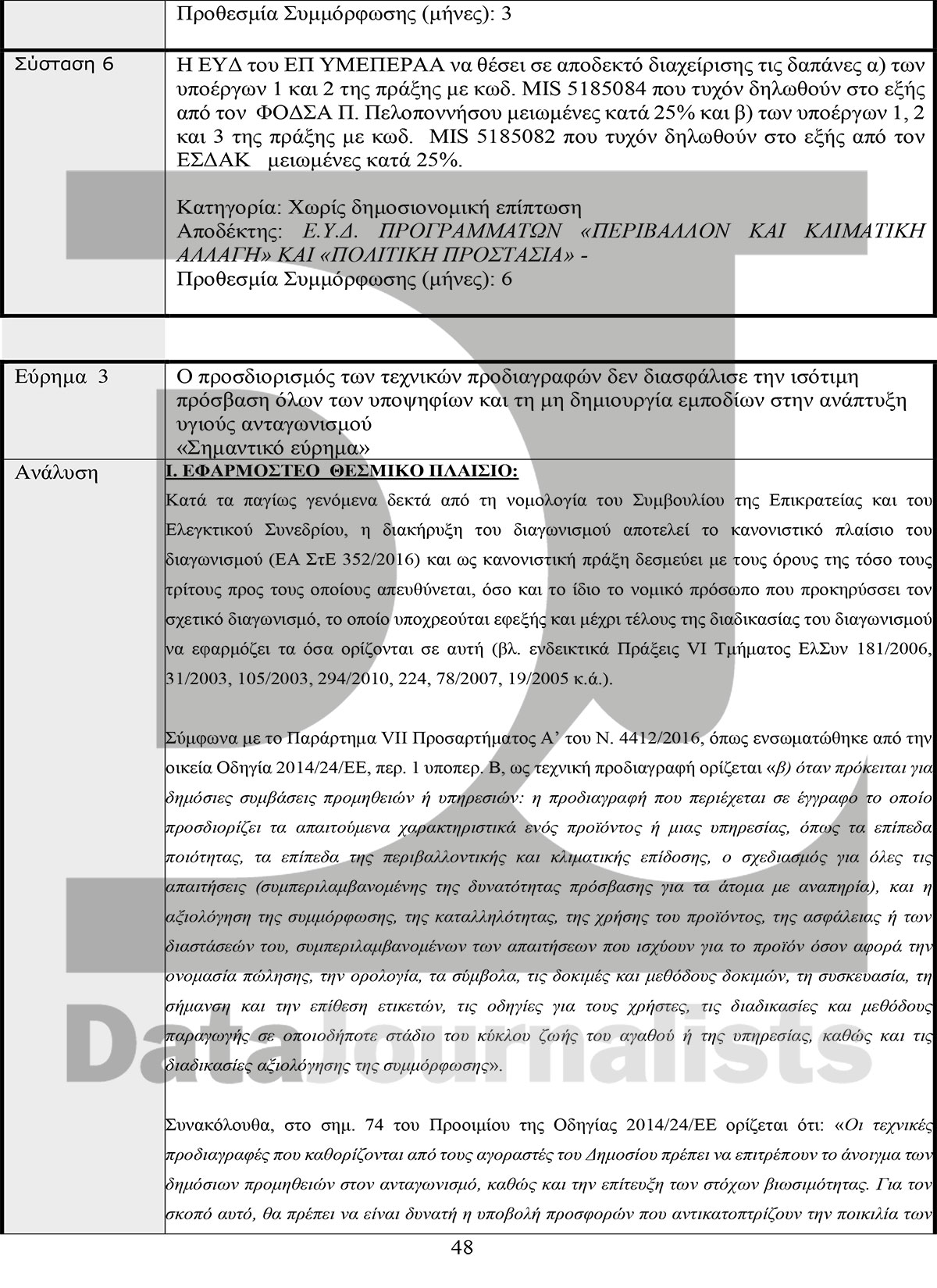 - Δεν διασφάλισαν την ισότιμη πρόσβαση όλων των υποψηφίων αναδόχων και την μη δημιουργία εμποδίων στον υγιή ανταγωνισμό μέσα από τον προσδιορισμό των τεχνικών προδιαγραφών